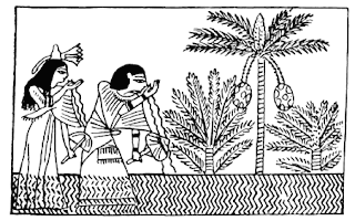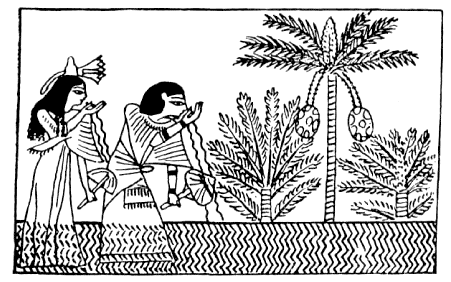 As representações egípcias mostram o falecido (às vezes com sua esposa) nesse paraíso celestial, bebendo a Água da Vida, da qual nasce a Planta da Vida, sob a forma de tamareira, com seus frutos doadores de vida.